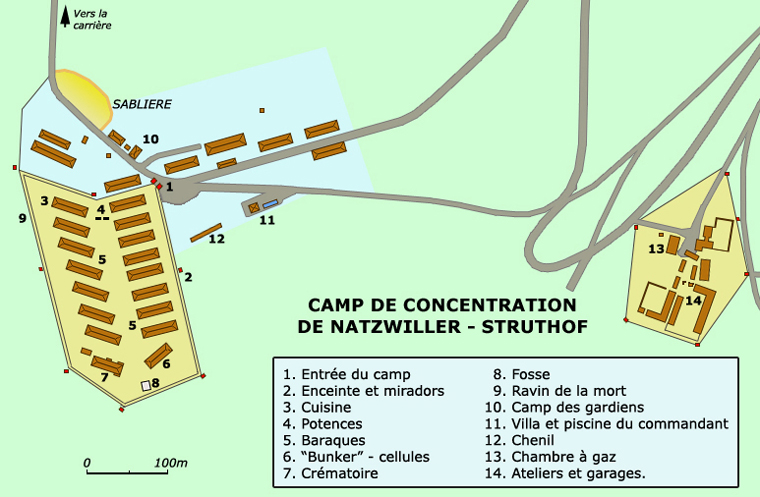 Toutes les routes figurant sur ce plan ont été construites par les internés du camp de Struthof. Etant donné la nature du terrain (du grès, et du granit rose pour la carrière), beaucoup d'internés en sont morts (on appelle la route principale "la route des 10000 crânes"). La chambre à gaz est située en dehors du camp: en fait elle a été construite avec peu de modifications, à partir d'une chambre utilisée pour l'entraînement au port de masques contre les gaz lacrymogènes par les S.S..
