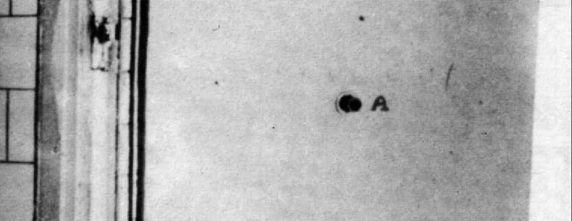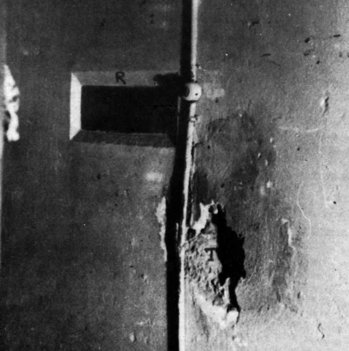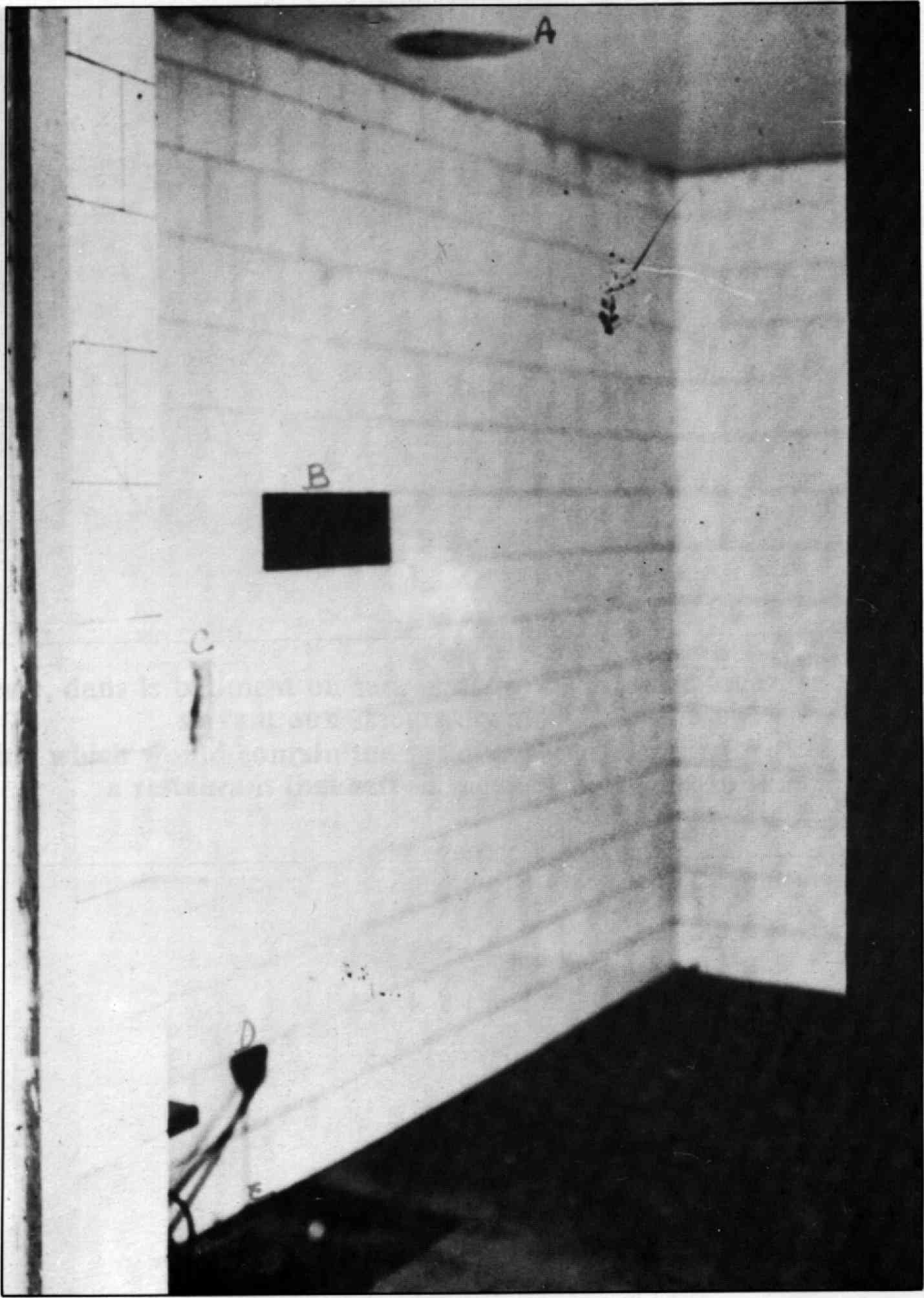 En-dessous de l'éclairage (A) et du regard (B) nous apercevons un trou (C) dans le mur qui est la trace du tuyau d'introduction des gaz hâtivement enlevé (puisqu'il n'a même pas été rebouché). La prise électrique plus bas (D) est postérieure au gazage des 86 juifs; elle a servi pour les expérimentations pour le gaz phosgène et servait à faire exploser l'ampoule contenant le gaz. Bickenbach a dit dans ses aveux que les prisonniers étaient priés de briser eux-même cette ampoule puis de marcher en rond afin d'éviter les poches de gaz concentré. Certains témoins ont effectivement rapporté de telles choses, mais aussi des incidents (des "sujets" déclarant avoir brisé les deux ampoules mais attendant le démarrage de la ventilation pour briser la seconde, qu'ils dissimulaient), et le "protocole" a donc pu être changé ensuite. Comme d'autres témoins ont parlé d'un dispositif électrique brisant cette ampoule, il est plausible que Bickenbach ait voulu se décharger de l'accusation d'avoir personnellement déclenché le bris de l'ampoule. Enfin, tout en bas et droit en-dessous de la prise, on aperçoit assez mal le réceptacle des produits cyanurés qui a été installé par le détenu Weydert (cette difficulté tient à notre matériel de scannage des documents et le réceptacle est bien visible sur la photo originale).
