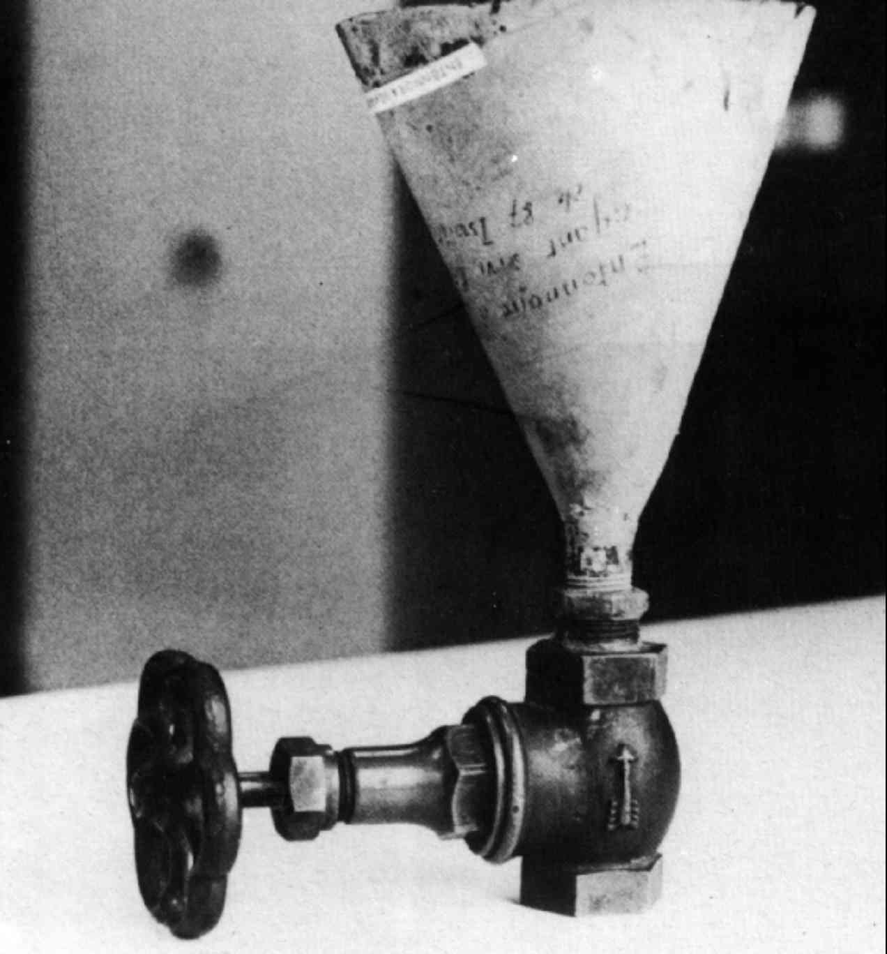 A tap was fitted into the piece of pipe immediately below the funnel. The purpose of this device was to pour a liquid--I have no idea what liquid --into the funnel with the tap turned shut, and then, at a chosen moment, to cause this liquid to flow towards the gas chamber and into the porcelain receptacle, where another liquid would have been placed in advance. [In fact, J. Kramer placed crystals in the porcelain receptacle.] The chemical reaction between the two liquids was to result in the release of toxic gas, designed to asphyxiate prisoners enclosed in the chamber. [The witness is extrapolating. How could he have known that the system would be used to gas prisoners? If he had such knowledge through an indiscretion, he should have said so and his deposition would thereby have taken on even more weight.]